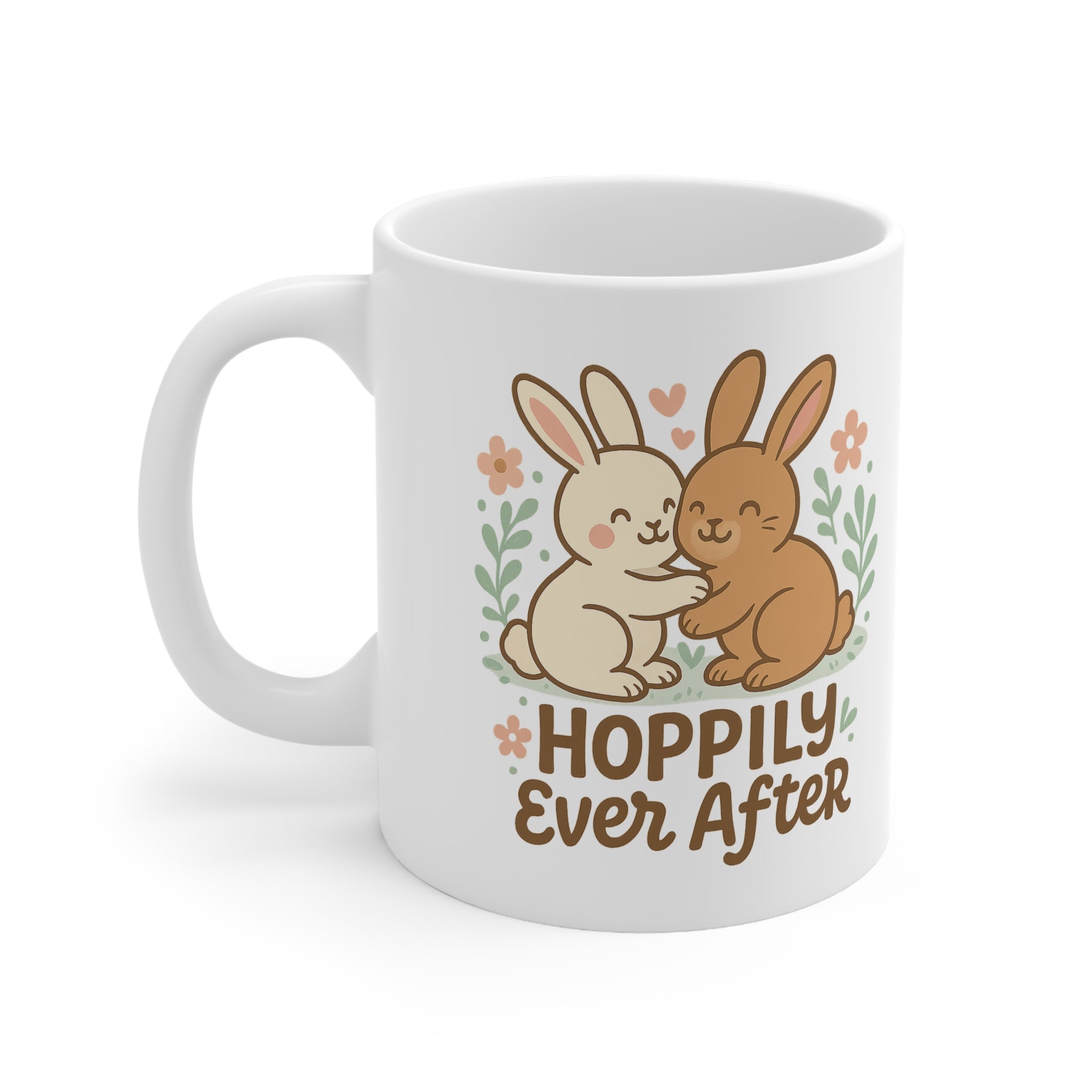 This "Hoppily Ever After" bunny mug features an adorable cartoon-style design of two cuddly rabbits surrounded by pastel flowers, hearts, and greenery — perfect for anyone who loves rabbits, animals, and heart-warming gifts.