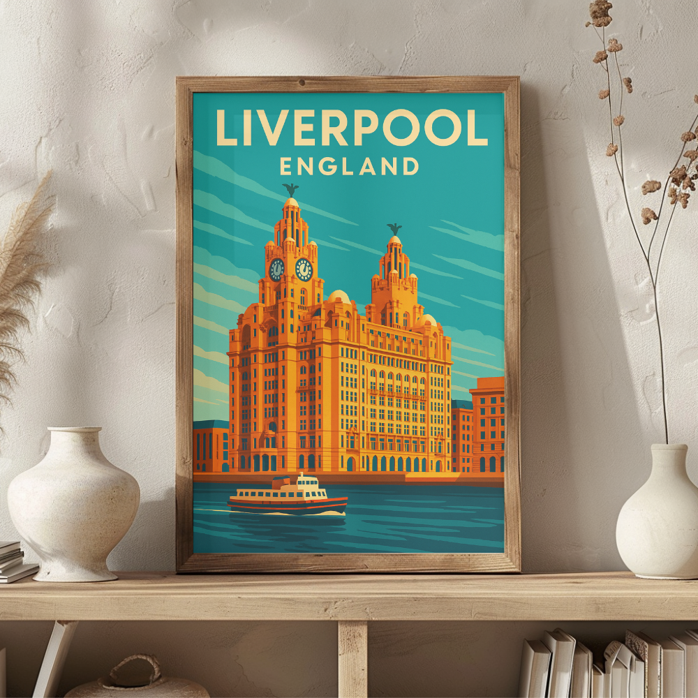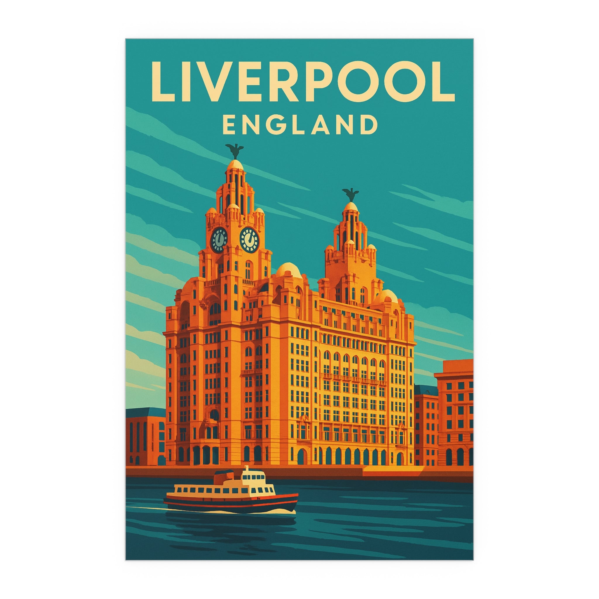 Enjoy free UK delivery on this vintage travel poster that beautifully showcases the heritage and skyline of Liverpool. Featuring the iconic Royal Liver Building alongside a River Mersey ferry, this print is designed in a bold mid-century style that captures the essence of this maritime city. It's an ideal choice for enthusiasts of the Beatles, history, or travel art, making it a thoughtful gift or a striking décor piece for homes, studios, or anyone who loves the city.