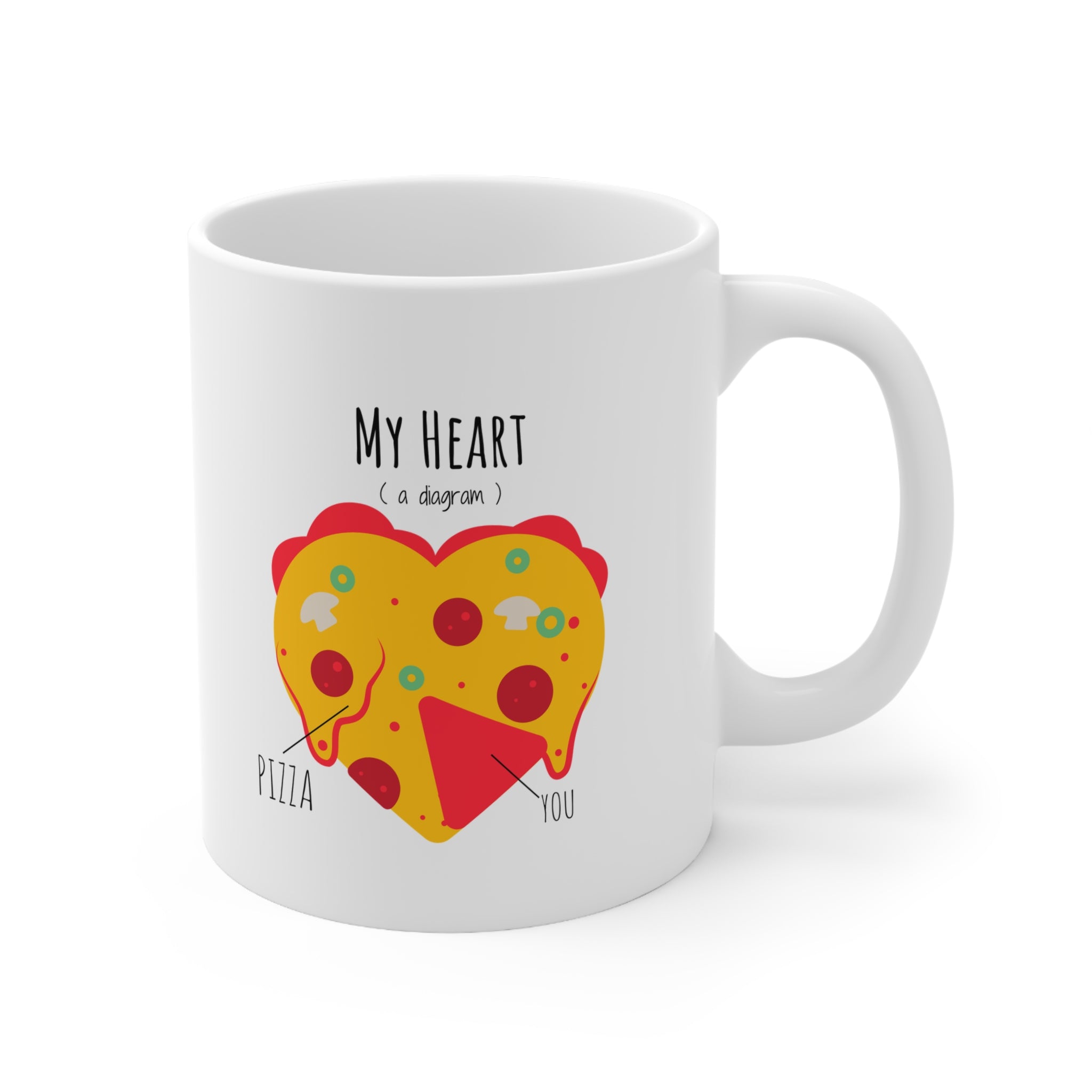 This “My Heart (a diagram)” mug features a hilarious pizza heart design showing exactly what matters most — pizza… and you.