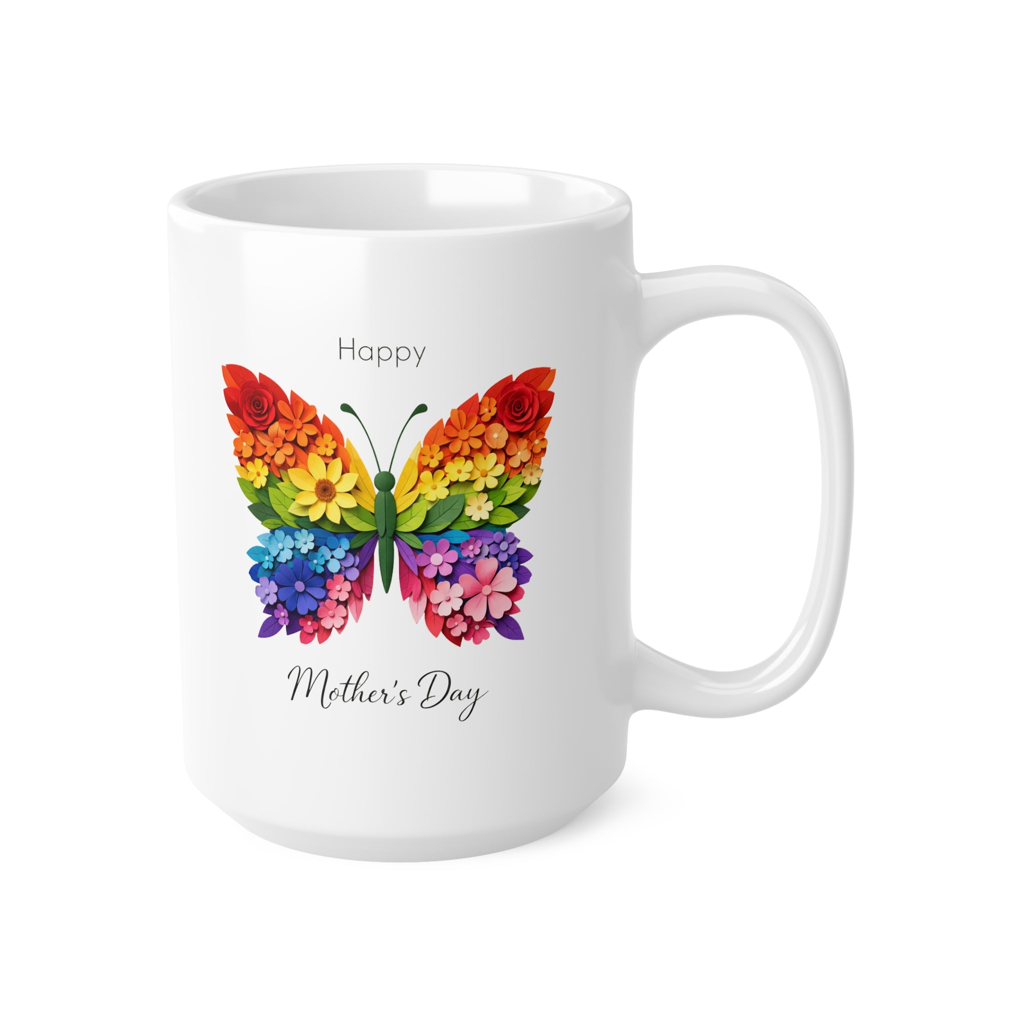 This vibrant Rainbow Floral Butterfly Mother’s Day Mug features a stunning paper-cut style butterfly created from layered flowers in a full rainbow colour palette. With elegant “Happy” typography above and delicate handwritten “Mother’s Day” lettering below, this mug is designed to feel heartfelt, artistic and timeless.